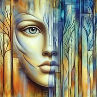Eine surreale Darstellung eines menschlichen Gesichts, das mit abstrakten Bäumen verschmilzt. Das Kunstwerk vereint organische und geometrische Elemente in leuchtenden Farben.