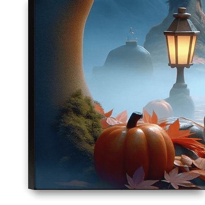 Unter einem mystischen Herbsthimmel versammeln sich Tier-Ritter zu Halloween. Kürbisse, Laternen und fallende Blätter schaffen eine gruselig-schöne Stimmung. Ein Hasenritter, ein Eichhörnchen und zwei Katzenritter stehen wachsam vor dem eindrucksvollen Tor eines Schlosses. Ihre Silhouetten zeichnen sich gegen die dämmernden Farben des…