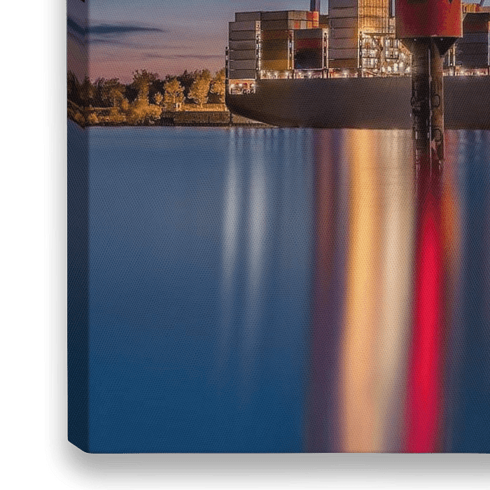 Containerterminal im hamburger Industrie Hafen an der Elbe. Grosse Kräne verladen Container auf ein Containerschiff. Stimmungsvolle Hafenansicht von Hamburg am Abend zur blauen Stunde.