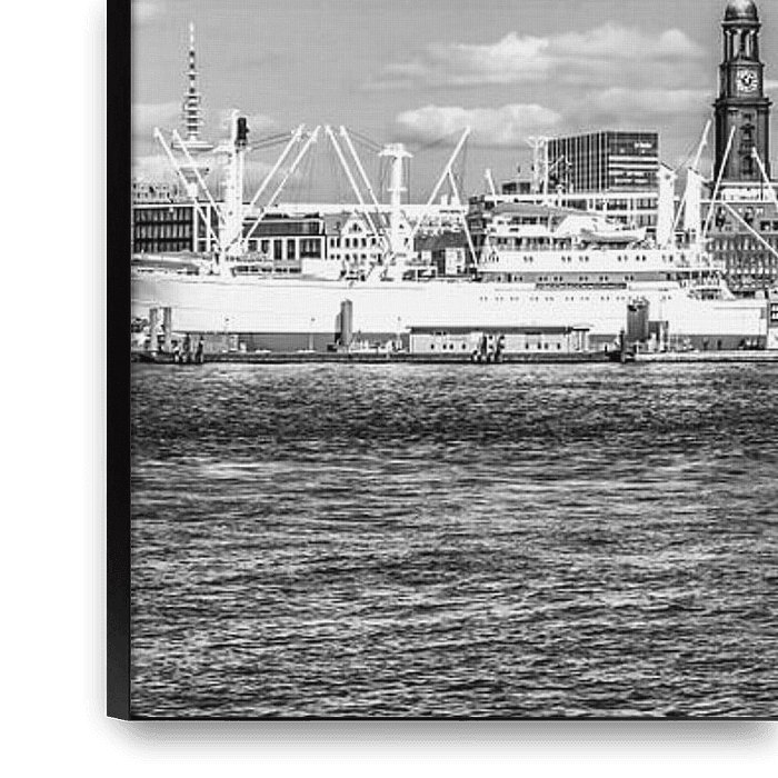Von der Elbinsel Steinwerder beim Hafentheater hat man einen wunderbaren Blick auf die Landungsbrücken mit dem Wahrzeichen Michel St. Michaelis-Kirche, der Elbphilharmonie und der Hafencity. Mit dem Panoramabild, ist zu verstehen, dass "Hamburg meine Perle" genannt wird. Besonders bei diesem, in Schwarz/Weiß gemachten Bild…