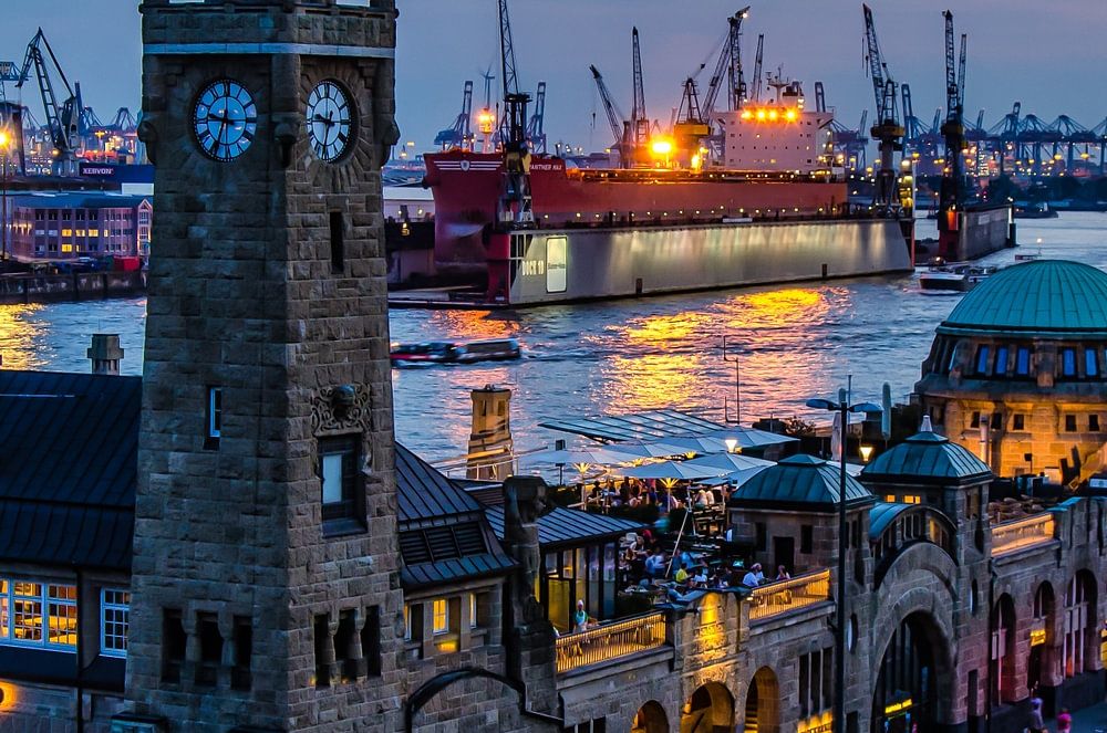Hamburg St Pauli Landungsbrücken mit Schiffswerften Docks und Elbe bei Dämmerung Deutschland