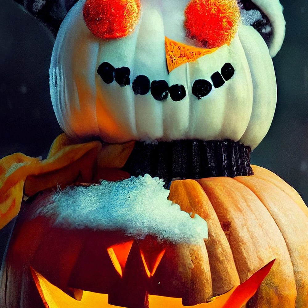 Illustration eines glücklichen Schneemanns während des gruseligen und dunklen Halloween. Der Schneemann hat einen Körper aus zwei Kürbissen und einen weißen Hut.