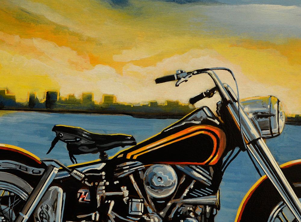 Realistisches Acrylgemälde einer Harley Davidson Duo Glide, eine Auftragsarbeit des Künstlers Paul Meijering - das Originalgemälde ist 90 x 120 cm groß.