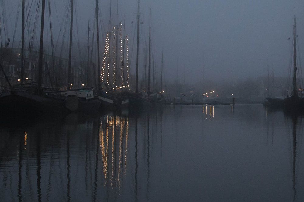De Zuiderhaven van Harlingen in mist gehuld. De weerspiegeling is te zien in het water.