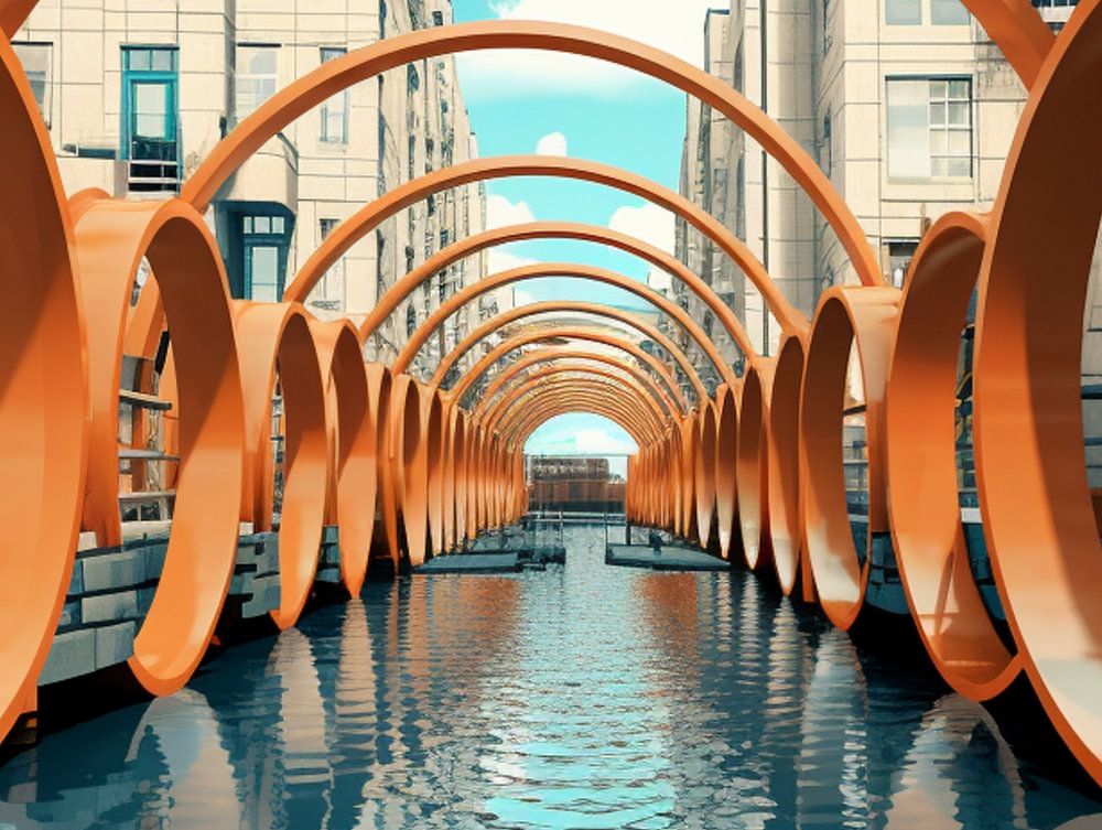 Die orangefarbenen Bögen, die wie eine Brücke zwischen städtischem Leben und Natur wirken, schweben anmutig über einem ruhigen Wasserkanal. Das spiegelnde Wasser unterstreicht die Verschmelzung dieser beiden Welten, wobei jeder Bogen einen vollen Kreis bildet - eine Anspielung auf Ganzheit und Einheit.