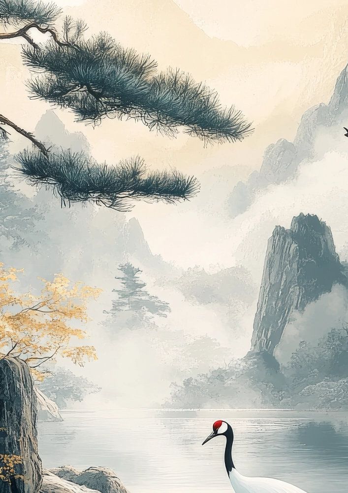 Ein heiteres Landschaftsgemälde mit Vögeln, Bäumen und Flüssen, das das friedliche Gleichgewicht der Natur illustriert.