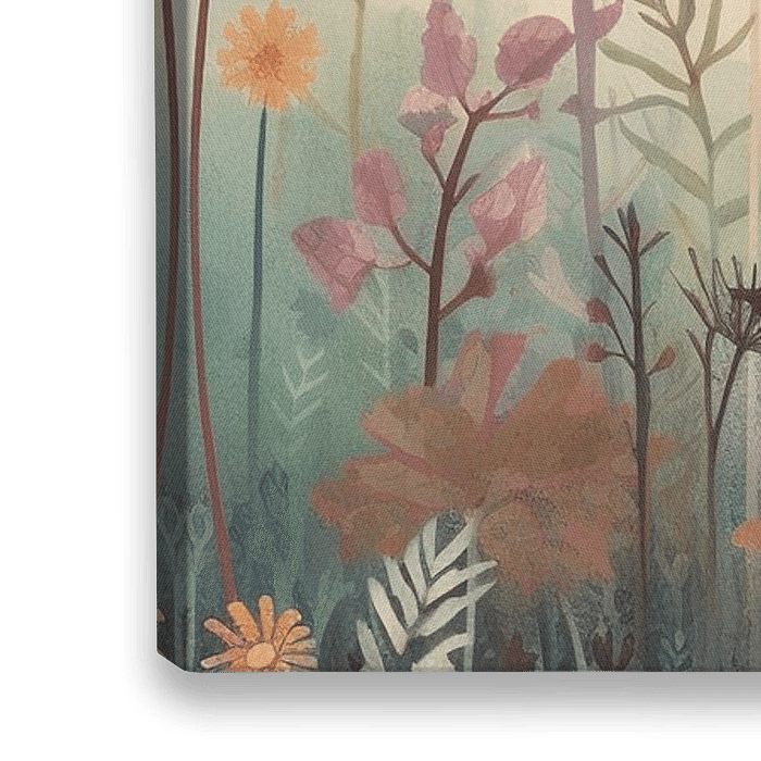 Harmonie - Diese bezaubernde Szene zeigt einen friedlich aussehenden Hund, der sich inmitten eines blühenden Feldes voller Wildblumen versteckt. Die Farben sind warm und weich, mit einer Palette von Orange bis Rosa und einem subtilen Hauch von Blau, was eine idyllische Atmosphäre schafft. Der Illustrationsstil wirkt nostalgisch und…