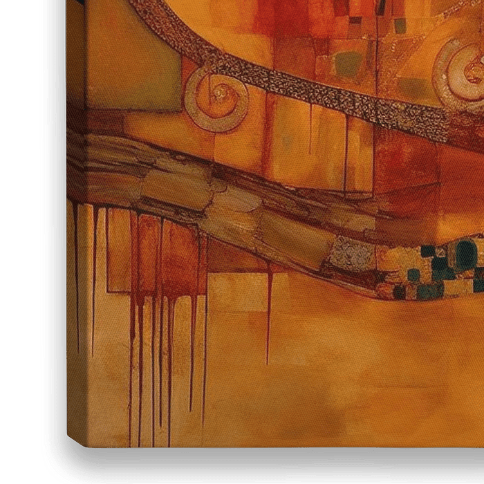 Harmony - Dieses ausdrucksstarke abstrakte Gemälde zeigt eine harmonische Komposition aus geschwungenen Formen und geometrischen Mustern, mit einer warmen und einladenden Farbpalette, die von Orange- und Brauntönen dominiert wird. Die Verwendung von Goldakzenten und die Schichtung von Texturen verleihen dem Werk eine Tiefe, die sofort…
