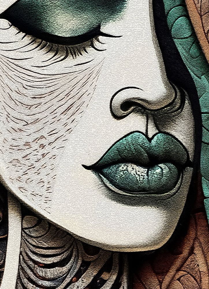 Treten Sie ein in die bezaubernde Welt von "Harmonious Fusion", einem abstrakten digitalen Gemälde, das eine wunderschöne Schöpfung verkörpert. Es zeigt eine geheimnisvolle Figur mit langen Haaren, die weder männlich noch weiblich ist. Mit schwülen grünen Lippen und pastellgrünen Augen ist dieses Kunstwerk eine Feier der Vielfalt, der Schönheit und des Humors.