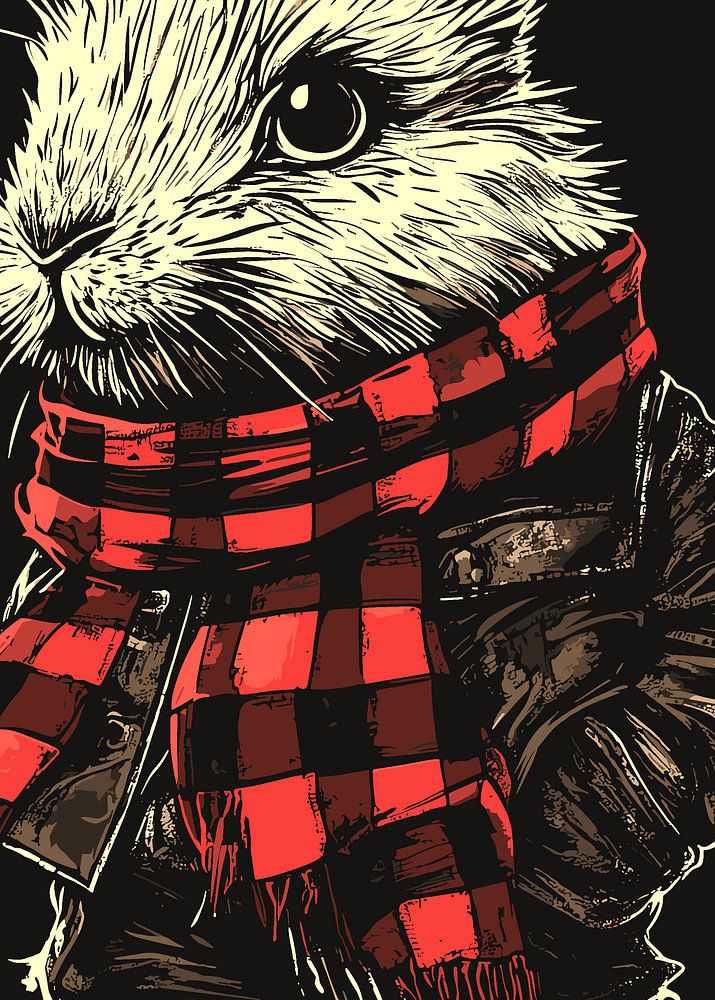 Ein stehender Hase trägt eine Lederjacke und einen rot-schwarz karierten Schal. Die Kleidung verleiht dem Tier eine urbane, selbstbewusste Ausstrahlung. Ein ungewöhnlicher Mix aus Niedlichkeit und Rock-Attitüde.