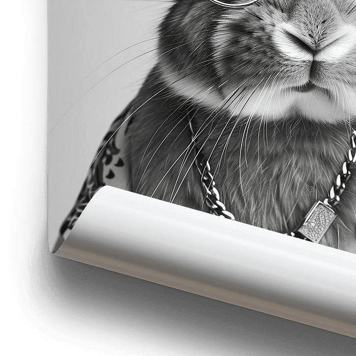 Porträt eines stilvollen Hasen in einem Hut und Sonnenbrille. Schwarz-weiß-Foto, das Modernität und Einzigartigkeit ausstrahlt.