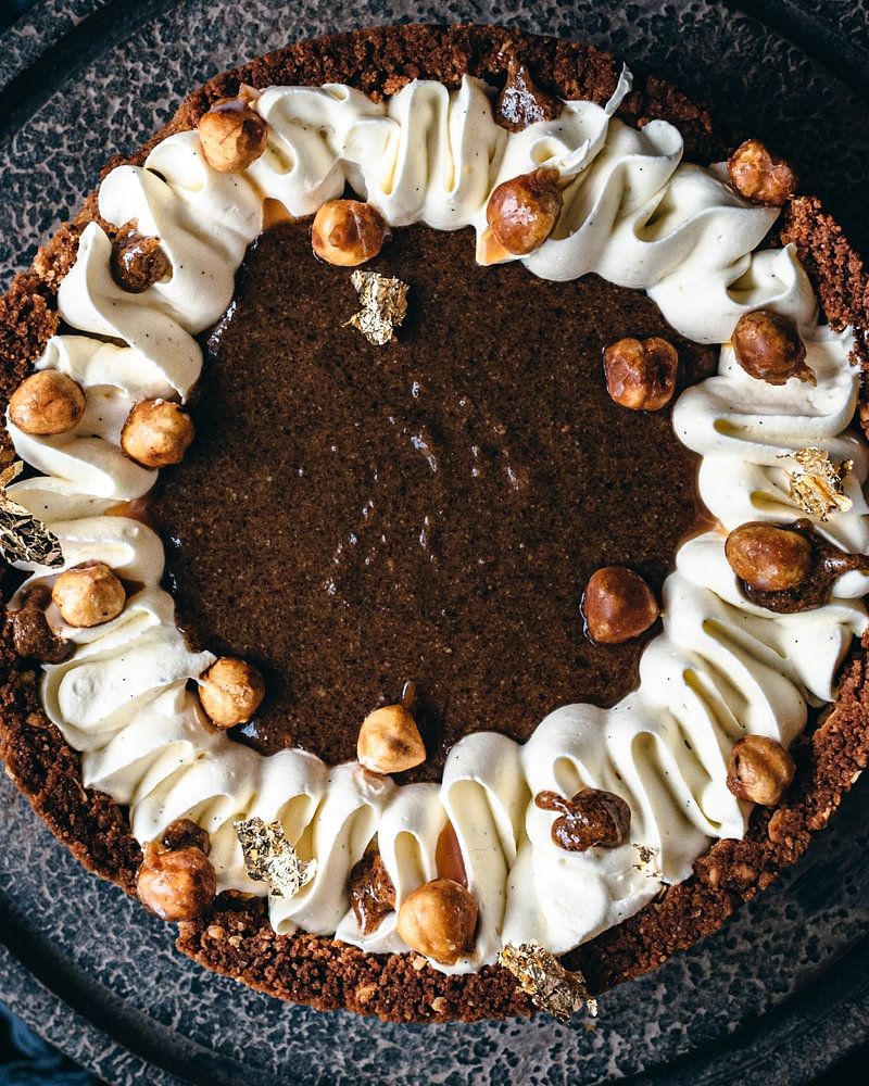 Flatlay eines Haselnuss-Karamell-Kuchens. Food-Fotografie eines Kuchens, gebacken von einem Kuchenbäcker in Limburg.