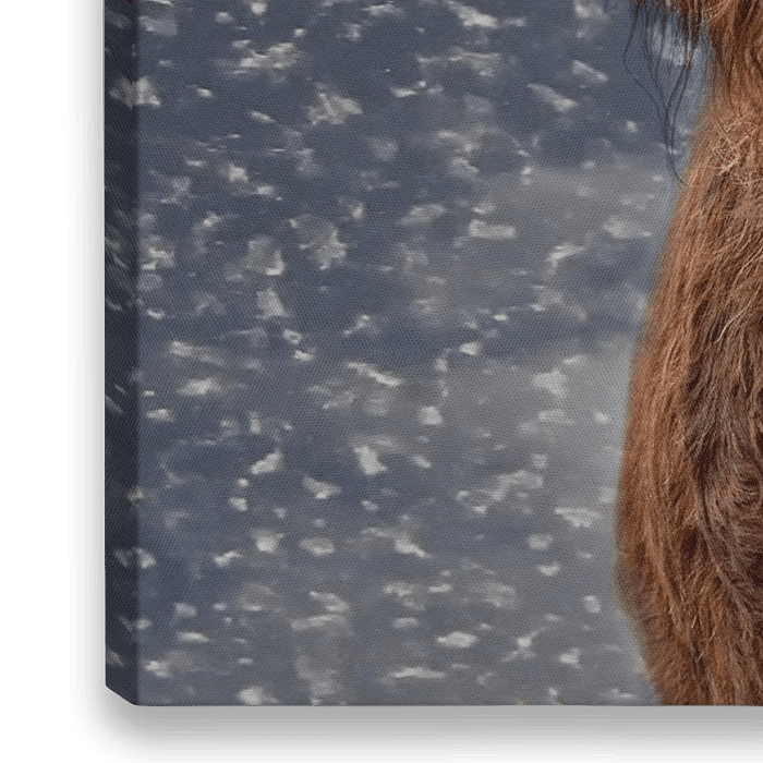 Portraet zweier schottischer Hochlandrinder mit winterlicher Textur. Bulle und Kuh enträchtig und imposant als Paar im Panoramaformat