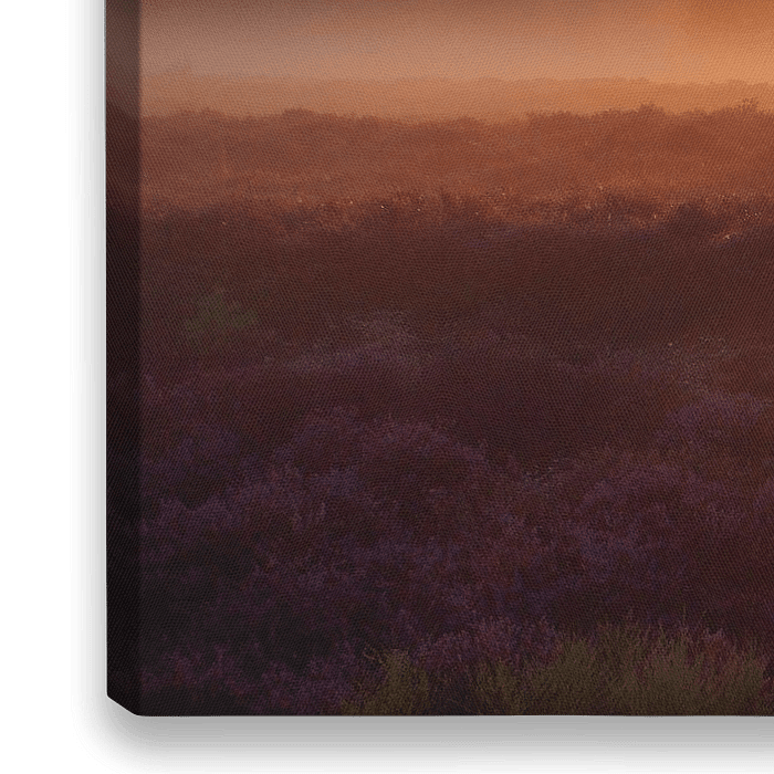 Die Niederlande von ihrer besten Seite am Morgen mit Nebel und aufgehender Sonne. Die ersten Sonnenstrahlen scheinen durch einen einzelnen Baum in einem violetten Heidefeld.