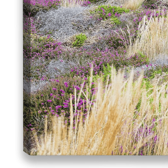 Lila Heidekraut in der Heidelandschaft am Zollweg bei Ploumanach an der zerklüfteten Küste der Côtes-d'Armor in der französischen Region Bretagne. Dieses Foto wurde an einem Sommerabend im Jahr 2015 aufgenommen