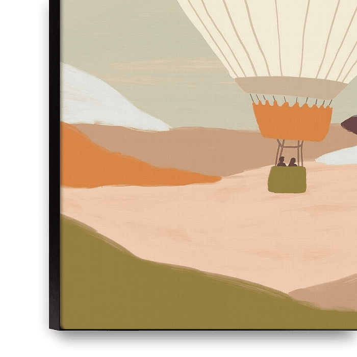 Eine heitere Illustration eines Heißluftballons, der über einer sanften Hügellandschaft schwebt. Die Farbpalette ist subtil und doch lebendig, mit Schattierungen von zartem Rosa, Altrosa, warmem Orange, sanftem Blau, Burgunderrot und Moosgrün. Diese Komposition strahlt Ruhe, Abenteuer und Eleganz aus - perfekt als moderne Wanddekoration…