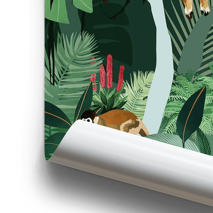 Eine Szene aus dem Dschungel voller Bäume, Pflanzen und Tiere. Eine farbenfrohe, lebhafte Illustration, sehr geeignet als Tapete.