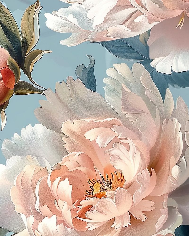 Hellrosa Pfingstrosen auf hellblauem Hintergrund. Sehr raffinierte Arbeit.