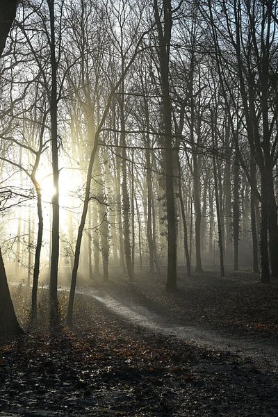Landschaft im Hemmensebos in Hemmen, Overbetuwe in Gelderland. Es ist neblig und die Sonne geht auf. Das goldene Licht breitet sich zwischen den Bäumen aus.