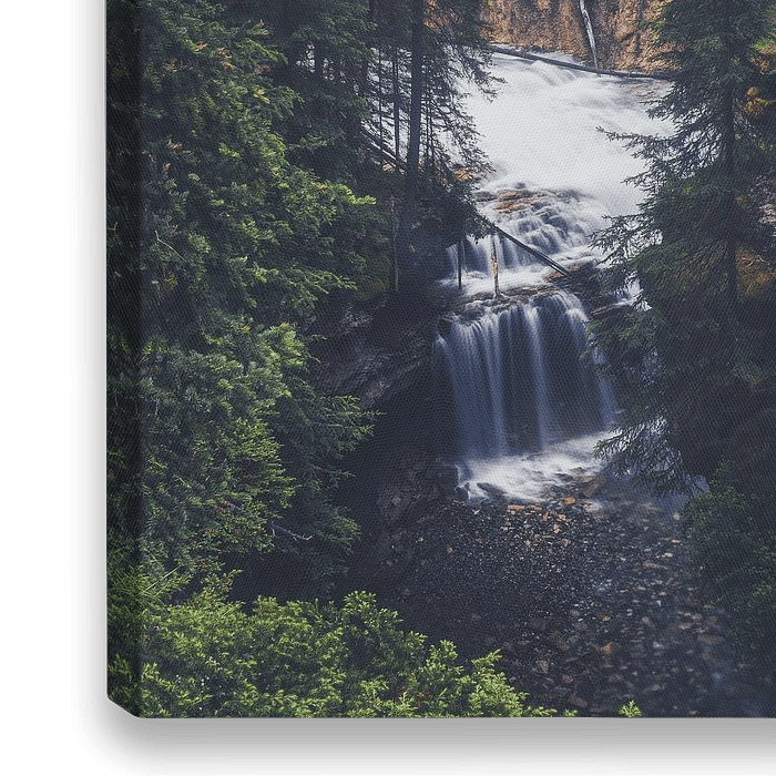 Schöner Wasserfall, der durch nebelhafte mysteriöse Kiefernwälder im Banff-Nationalpark eingefaßt wird.
