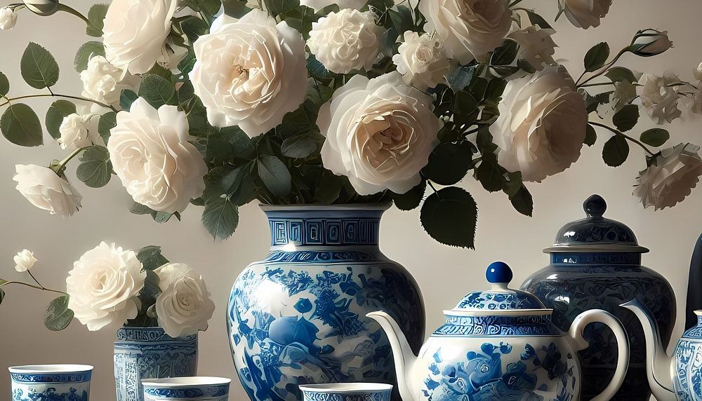 Dieses Kunstwerk stellt ein klassisches Stillleben dar, das die Schönheit zeitloser Eleganz perfekt zum Ausdruck bringt. Auf einem Holztisch stehen sorgfältig arrangierte blaue und weiße Porzellangegenstände, darunter eine große Vase, die mit üppigen weißen Rosen und anderen Blumen gefüllt ist. Die zarten Porzellangegenstände wie eine Teekanne, Tassen und Schalen sind mit traditionellen Mustern verziert, die an östlich inspirierte Töpferwaren erinnern.