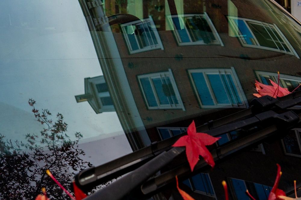 Schöne rote Herbstblätter auf der Windschutzscheibe eines Autos