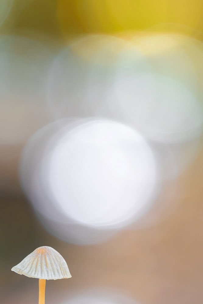 Kleiner Pilz auf einem Baumstumpf. Der schöne Bokeh-Hintergrund und die weichen Farben und Schattierungen machen dieses Bild zu einem schönen Bild für die Wand. Zeitlos und berührend.