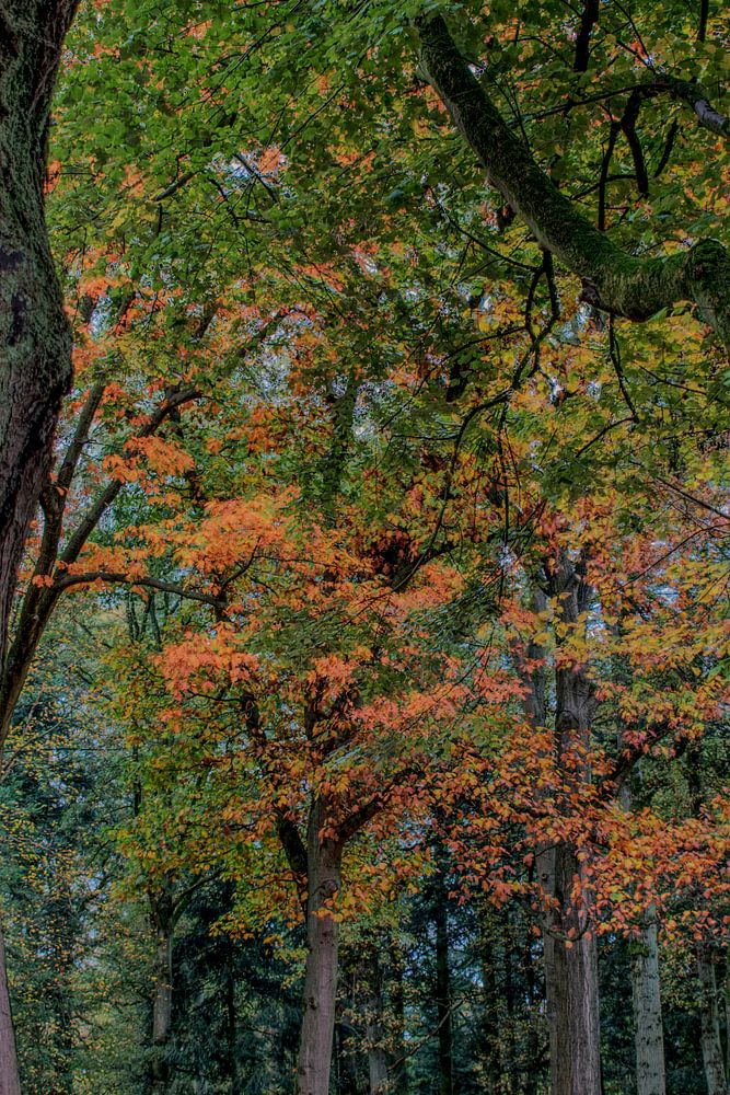Schöne, warme Farben im Park, der Boden übersät mit gefallenen Blättern in einer herbstlichen Farbpalette.