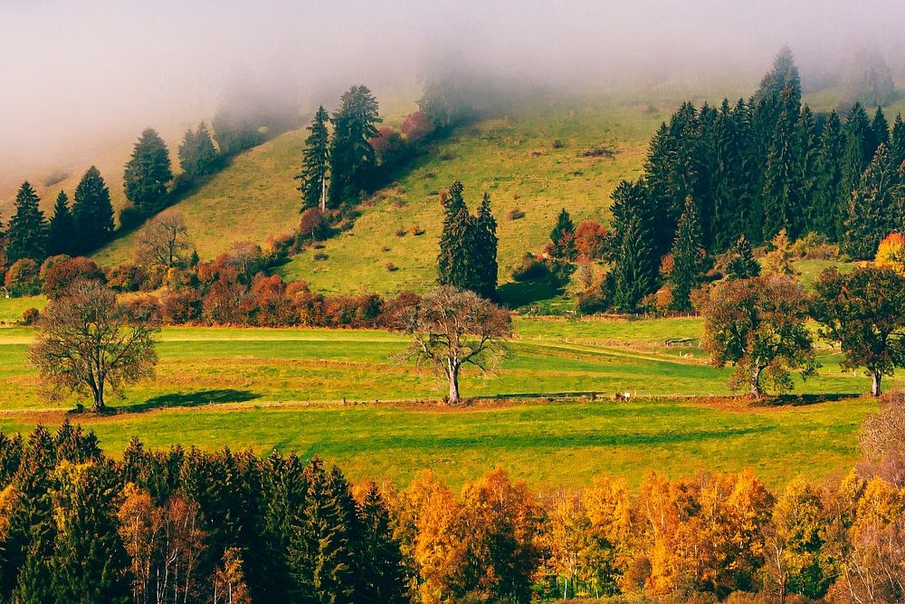 Ein schöner Frühherbstmorgen am Grüntensee, einem See im Allgäu, in der Nähe von Kempten, in Bayern, in Süddeutschland.