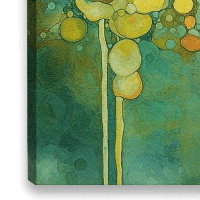 Herbst - Eine heitere Komposition abstrakter natürlicher Formen, die an ein Blumen- oder Laubfeld erinnern und in eine sanfte Palette von Gelb-, Orange- und Grüntönen getaucht sind. Die mehrschichtige Textur und die subtilen Farbabstufungen schaffen ein verträumtes und beruhigendes Ambiente.