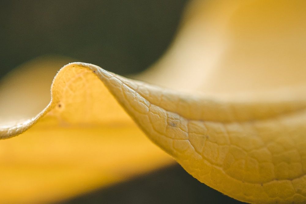 Eine Nahaufnahme eines schönen gelben Herbstblattes mit Betonung des Randes.
