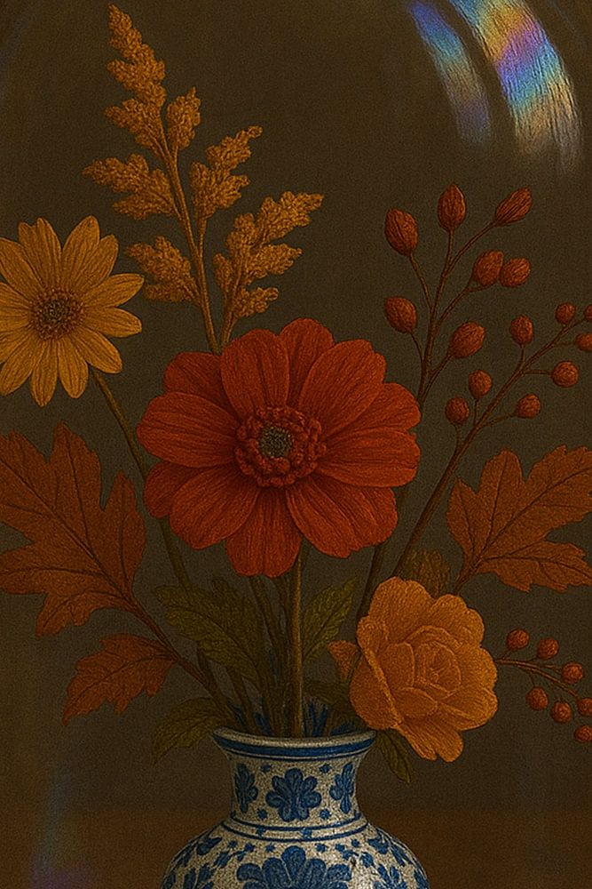 Ein stilvoller Herbststrauß mit warmen Orange-, Gelb- und Rottönen, elegant arrangiert in einer klassischen Vase in Delfter Blau. Die Glasglocke unterstreicht die intime Atmosphäre und verleiht diesem Stillleben einen zeitlosen Look. Eine subtile Kombination aus Herbstblättern, Blumen und Beeren, die perfekt zum warmen Glanz der Jahreszeit passt.
