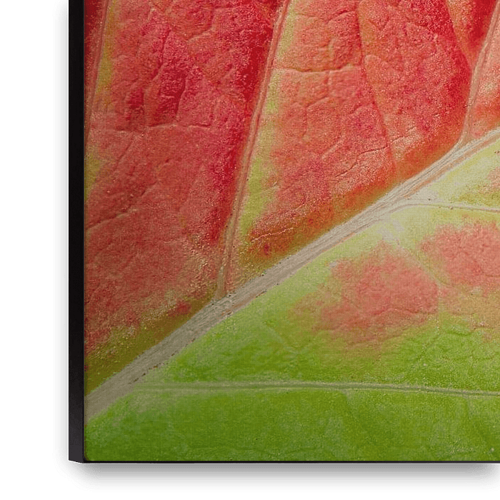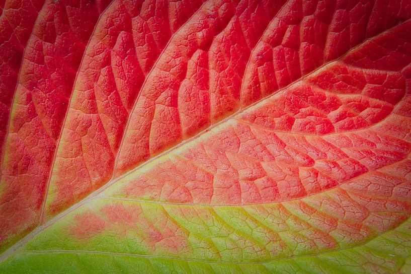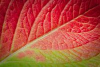 Eine Nahaufnahme der Schönheit des Herbstes. Ein Bild eines Pflanzenblatts im Herbst mit wunderschönen Farben. Durch die Farben fallen die Adern besonders ins Auge.