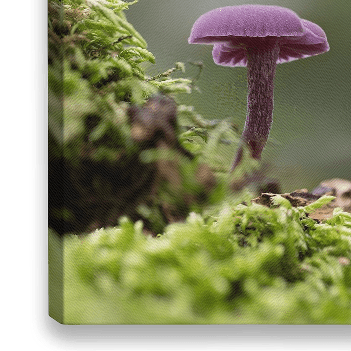 Amethystblaue Lacktrichterling umgeben von grünem Moos im Wald mit Lichtbokeh