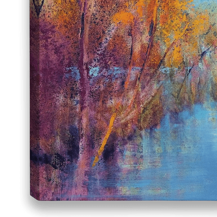Leuchtender heller Himmel mit weitem Horizont, starker Kontrast mit dem rot und gelb gefärbten Herbstlaub. Das Bild vermittelt Kraft und Lebensfreude. Die intensiven Farben spiegeln sich im Wasser des kleinen Flusses.