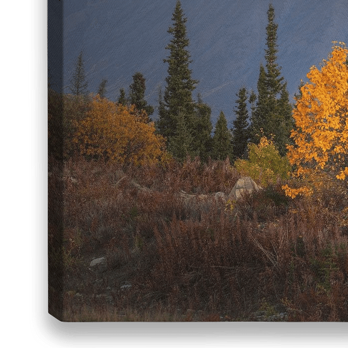 Herbstlandschaft im Kluane-Nationalpark im Yukon-Territorium im Norden Kanadas. Das Foto zeigt gelbe, herbstlich gefärbte Bäume vor einer Bergkulisse. Die Sonne ist gerade untergegangen.