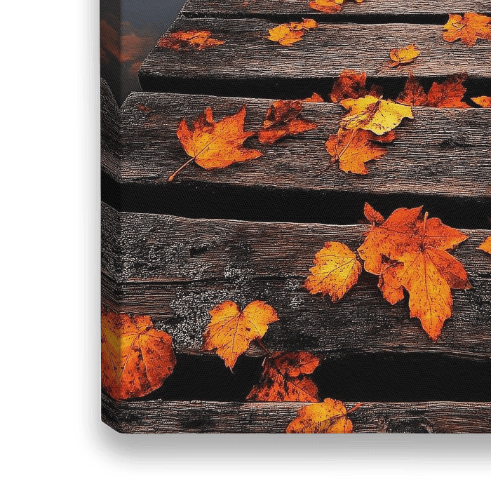 Ein melancholischer Steg, umrahmt von leuchtend orangefarbenen Blättern, lädt dazu ein, in die Stille des Nebels einzutauchen. Der sanfte Kontrast zwischen Wasser und Holz schafft eine harmonische Atmosphäre. Ideal für das Wohnzimmer, um Momente der Besinnung und Entspannung zu fördern. Dieses Bild bringt die ruhige Schönheit des Herbstes ins Zuhause.
