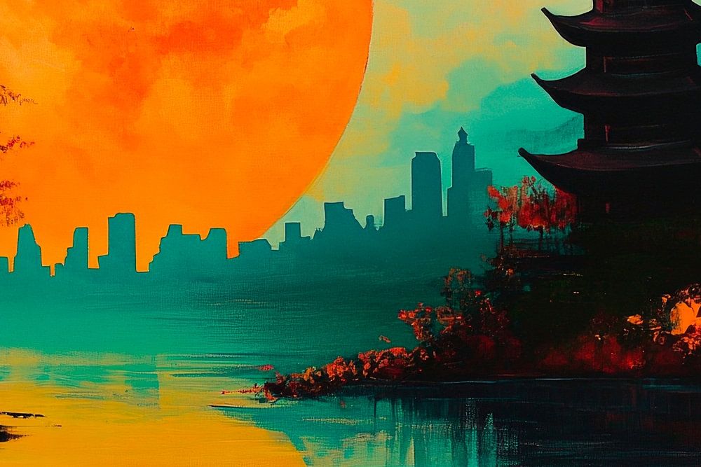 Ein strahlender Sonnenuntergang taucht die Szenerie in warmes Orange und tiefes Rot, während die Silhouette eines eleganten Pagodenbaus sanft im Wasser spiegelt. Umrahmt von herbstlichen Bäumen, strahlt das Bild Ruhe und Harmonie aus, ideal für ein Wohnzimmer, das Gemütlichkeit und eine friedliche Atmosphäre ausstrahlen soll.