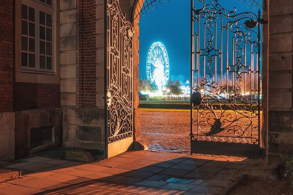Man muss zugeben, dass dieses Motiv in Münster recht bekannt ist. Wenn in Münster Send (Jahrmarkt/Kirmes) ist, und das Riesenrad an passender Stelle aufgebaut wird, kann man diese Bildkomposition durch das Tor am Schloss entdecken. Da hinter dem Tor noch große Scheinwerfer das Schloss anstrahlen, fällt ein toller Schatten durch das Tor.