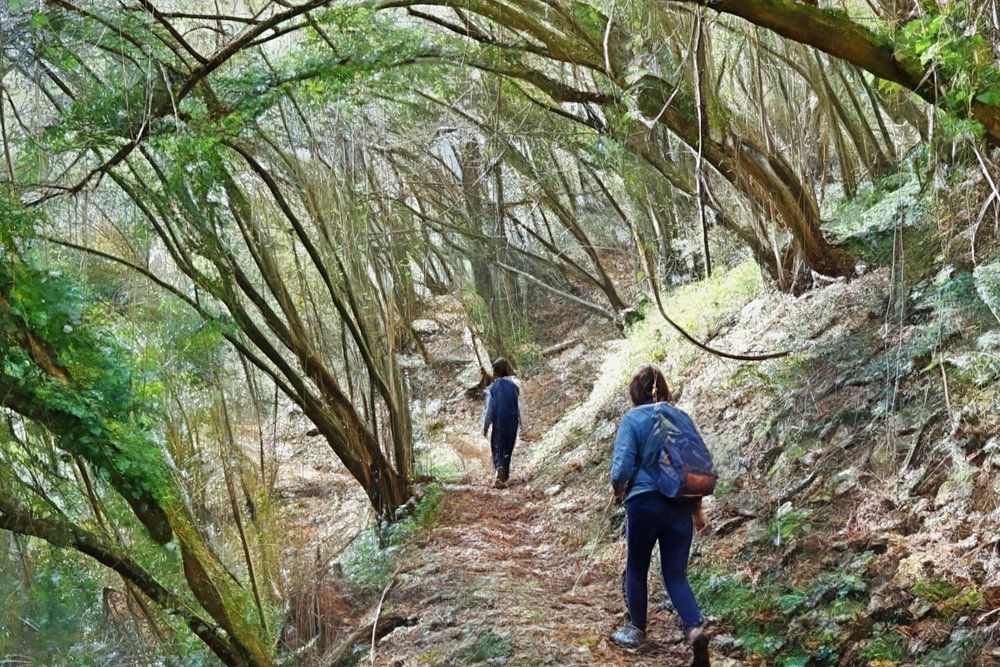 Ein Spaziergang auf einem mit Blättern bedeckten Weg in einem dichten Wald. Die Bäume sind hoch und ihre Äste bilden einen Baldachin über dem Kopf. Das Sonnenlicht filtert durch die Blätter und schafft eine ruhige und malerische Szene.