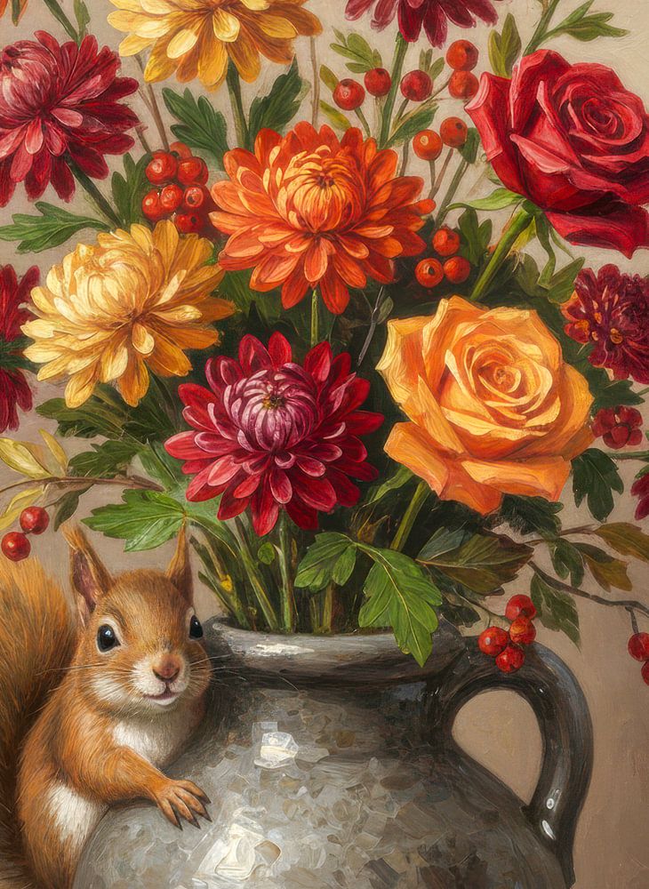 Bringen Sie mit diesem Stück sofortige Wärme und Fröhlichkeit in Ihr Interieur. Ein verspieltes Eichhörnchen schmiegt sich gemütlich an einen rustikalen Krug voller Herbstblumen in tiefen Rot-, Gelb- und Orangetönen. Die Kombination aus leuchtenden Blumen, weichen Pinselstrichen und natürlichen Details wie Nüssen und Blättern macht dieses Gemälde zu einem echten Blickfang.