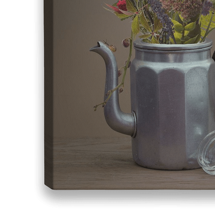 Eine alte Kaffeekanne wurde hier als Vase verwendet.
