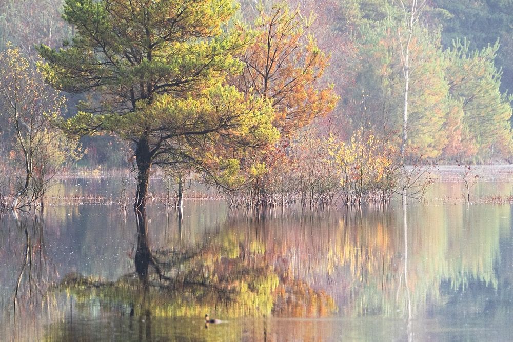 Aufgrund des starken Regens sind einige Bäume mit Wasser vollgelaufen. Es ist Mitte September und die Bäume beginnen sich zu verfärben. Es ist windstill und das führt zu einer perfekten Spiegelung im Wasser.