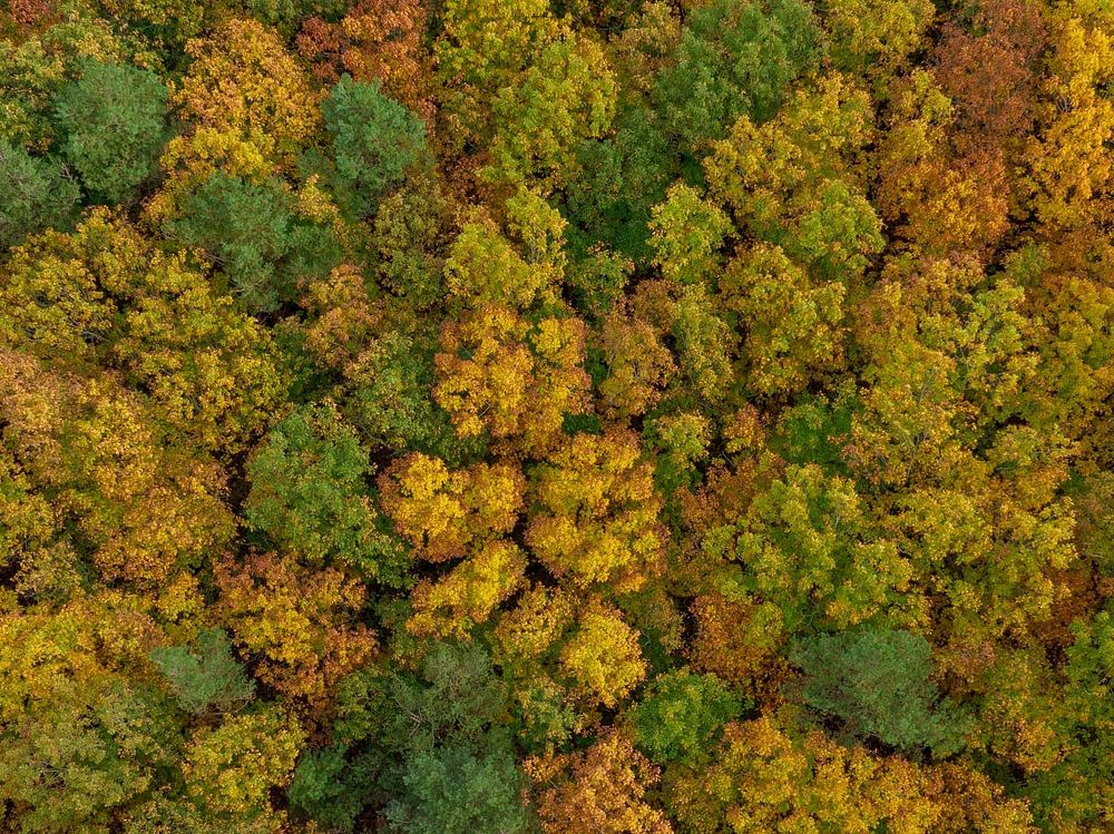 Blick von oben auf einen herbstlich gefärbten Wald im Naturschutzgebiet Veluwe.