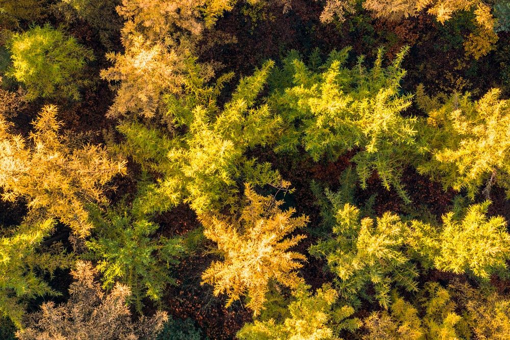 Herbstwald mit bunten Blättern von oben gesehen an einem schönen Herbsttag. Die Blätter an den Bäumen färben sich in diesem Waldgebiet in Gelderland, Niederlande.