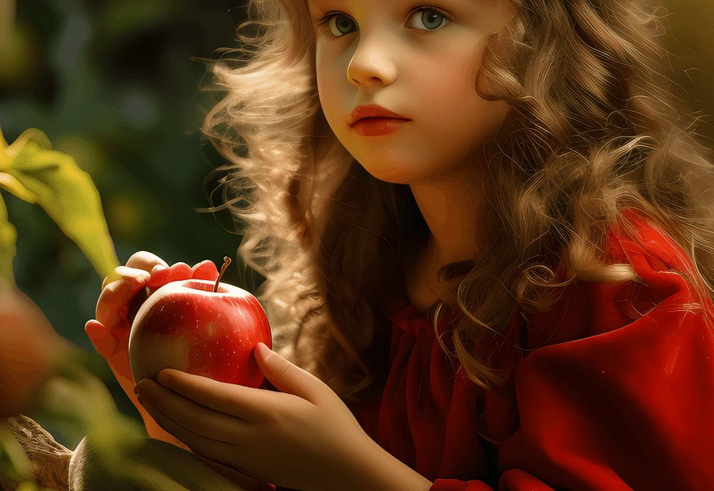 Sie hat einen Apfel in der Hand, aber sie zögert noch, einen Bissen davon zu nehmen. Sie hasst saure Äpfel, aber dieser ist so rot, dass das ganze Rot den sauren Geschmack verdrängt hat.