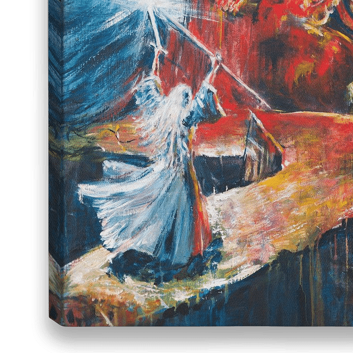 Bestelle dieses abstrakte Wandbild Herr der Ringe Gandalf Malerei Zauberer rot und blau von Anja Namink - Gemälde als Reproduktion auf Leinwand, Alu-Dibond, als Poster, Fototapete oder Acrylglasbild.