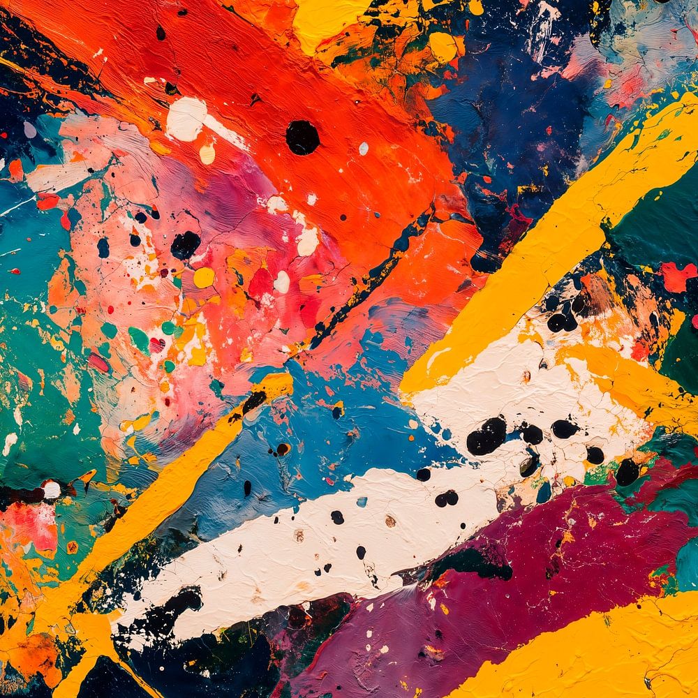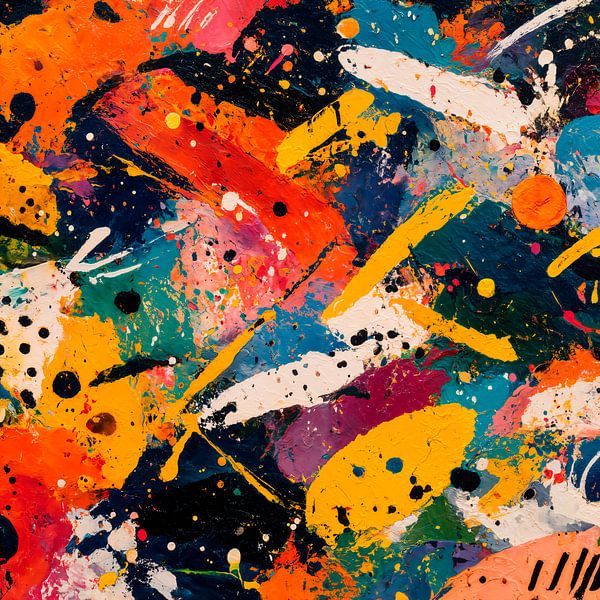 Ein Kunstwerk mit einer lebendigen und abstrakten Explosion von Farben und Texturen, das an ein Gemälde im Stil von Jackson Pollock erinnert. Kraftvolle Pinselstriche in verschiedenen Formen und Größen schaffen eine dynamische und energiegeladene Komposition.