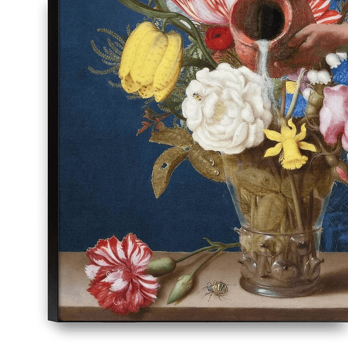 Die Blumen, die Sie sehen, sind von Stillleben anderer alter Meister des Goldenen Zeitalters übernommen, zum Beispiel von Ambrosius Bosschaert.
