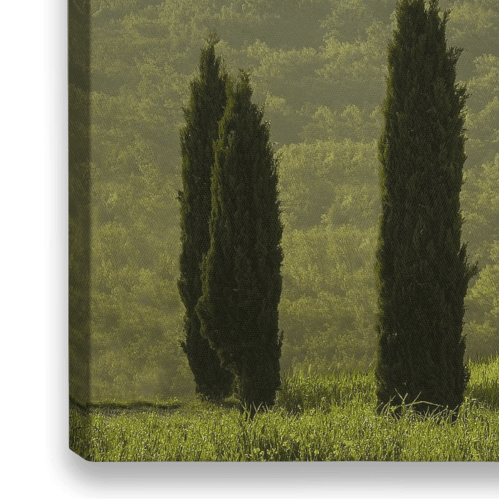 Tussen de groene heuvels zie je de 'Cappella Madonna di Vitaleta' en op de voorgrond een slingerpad met oude cipresbomen